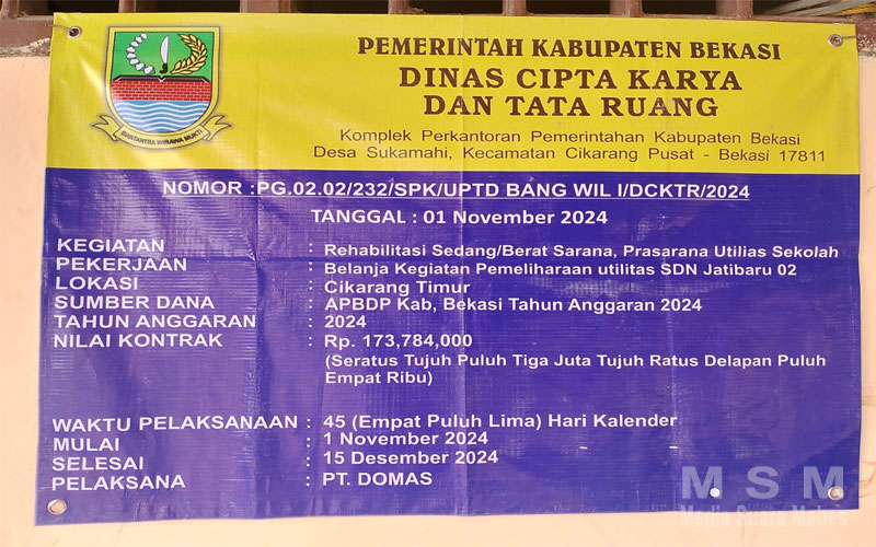 MediaSuaraMabes, Kab Bekasi – Kegiatan rehabilitasi sedang atau berat sarana prasarana utilias sekolah SDN Jatibaru 02 Kecamatan Cikarang Timur kabupaten Bekasi yang bersumber dari APBD Kabupaten Bekasi tahun anggaran 2024 yang dikerjakan oleh PT Domas dengan nilai anggaran Rp. 173.784.000 dengan waktu pekerjaan 45 kalender mendapatkan perhatian serius dari Dewan Pimpinan Daerah Jaringan Pengawas Kebijakan Pemerintah (DPD J.P.K.P.) kabupaten Bekasi Jawa Barat.