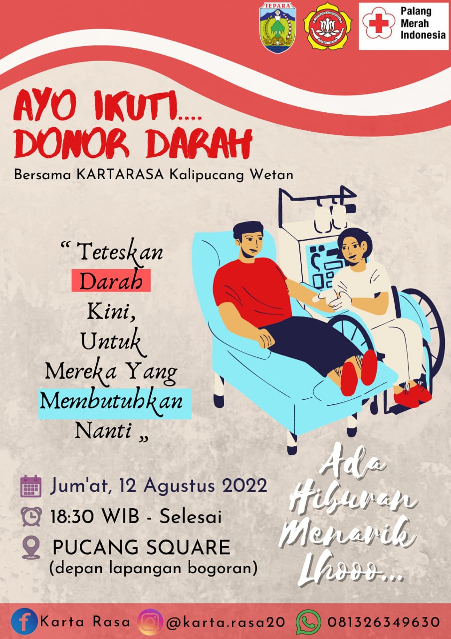 Hari Jum’at, 12 Agustus 2022, diadakan donor darah bersama kartarasa Kalipucang wetan. Kegiatan dimulai pukul : 18.30 WIB sampai selesai, tempat di Pucang Square (depan lapangan bogoran).