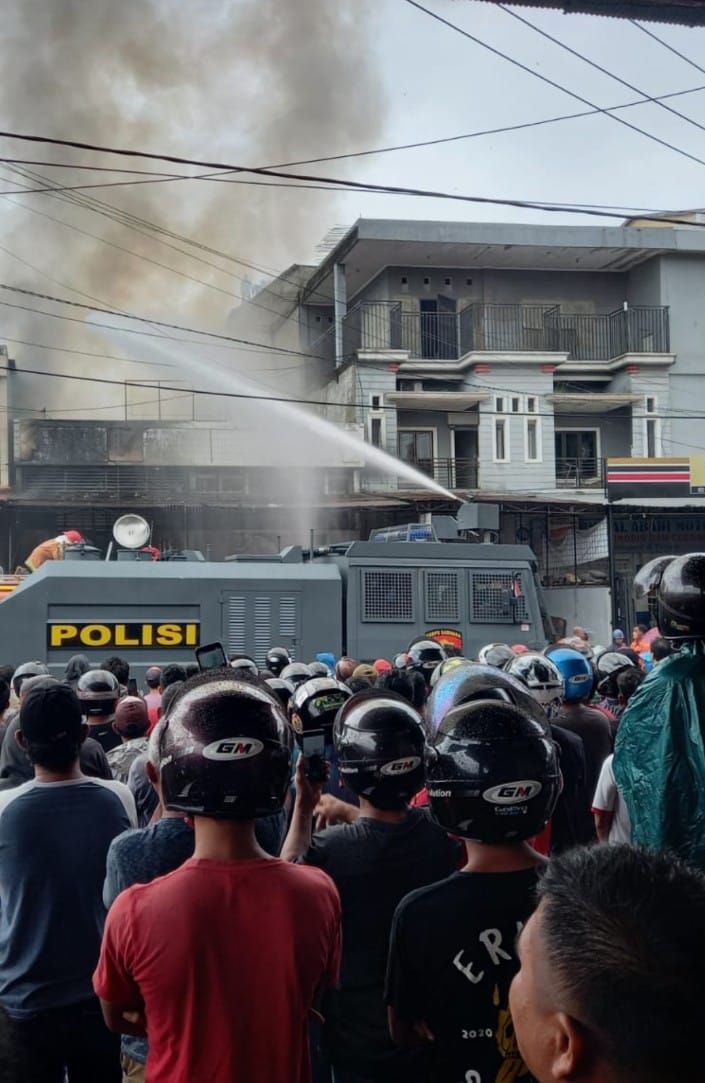 Sejumlah mobil pemadam terlihat kesulitan memadamkan api karena bangunan ruko saling berhimpitan dan diperparah lagi isi dalam ruko itu banyak stok barang yang mudah terbakar seperti ban dan Oli.
