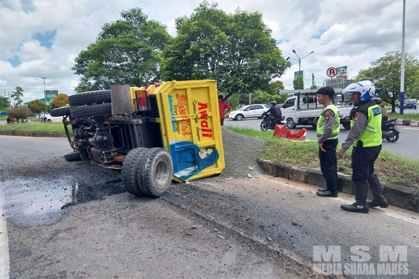 MediaSuaraMabes, Kubu Raya – Polres Kubu Raya, Polda Kalbar Sebuah truk pengangkut batu kerikil terguling di Bundaran Transmart Jalan Raya Arteri Supadio, Kecamatan Sungai Raya, Kabupaten Kubu Raya. Mobil truk dengan nopol K 1635 PA, yang dikendarai oleh Haji Madrai, mengalami patah as roda belakang hingga terguling ke kanan simpul jalan pada saat menikung di jalur kiri bundaran Transmart. Sabtu (13/5/23) jam 11.00 Wib.