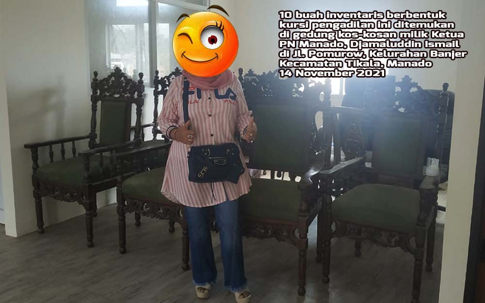 MediaSuaraMabes, Manado – Sejumlah inventaris kantor berbentuk perabotan kursi majelis hakim dan kursi council ditemukan berada di gedung kos-kosan milik Ketua PN Manado, Djamaludin Ismail, SH, MH. Total perabotan perkantoran itu sekitar 10 buah, terdiri dari 6 kursi majelis hakim warna hijau, 1 kursi council besar warna hitam, 1 kursi council sedang warna hitam, dan 2 kursi bantal kayu warna coklat. Keberadaan barang-barang, yang hampir dipastikan milik kantor PN Manado atau dari PN daerah lainnya, itu diketahui saat team investigasi media dari Persatuan Pewarta Warga Indonesia (PPWI) Nasional dan Sulawesi Utara menyambangi gedung kos-kosan mewah tersebut pada tanggal 14 November 2021 lalu.