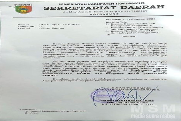 MediaSuaraMabes, Tanggamus – Berkaitan dengan Surat Edaran Bupati Kabupaten Tanggamus Nomor 420/462/20/2023 tanggal 17 Januari 2023 tentang sesuai dengan Permendiknas nomor 15 tahun 2005 tentang Standar Pelayanan Pendidikan (SPM) pendidikan dasar di kabupaten/kota dalam pasal 2 ayat (2) point b, butir 5 dinyatakan bahwa salah satu bentuk pelayanan minimal di tingkat satuan pendidikan setiap guru tetap bekerja 37,5 jam perminggu di satuan pendidikan.