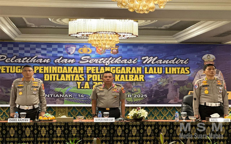 MediaSuaraMabes, Pontianak Kalbar – Sebagai upaya peningkatan kompetensi dan profesionalisme personel Polri dalam bidang penegakan hukum lalu lintas, Direktorat Lalu Lintas (Ditlantas) Polda Kalimantan Barat menyelenggarakan kegiatan sertifikasi mandiri bagi petugas penindakan pelanggaran lalu lintas, bertempat di Hotel Mahkota Pontianak, pada Rabu (17/12).