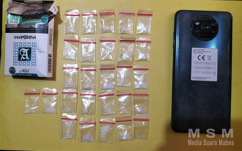 Diantaranya 1 buah kotak rokok Sampoerna warna putih yang di dalamnya berisikan 27 paket kristal warna putih diduga narkotika jenis shabu serta 1 unit Handphone.