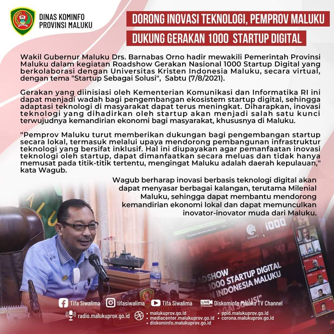 SuaraMabes, Maluku – Wakil Gubernur Maluku Drs. Barnabas Orno hadir mewakili Pemerintah Provinsi Maluku dalam kegiatan Roadshow Gerakan Nasional 1000 Startup Digital yang berkolaborasi dengan Universitas Kristen Indonesia Maluku, secara virtual, dengan tema “Startup Sebagai Solusi”, Sabtu (7/8/2021).