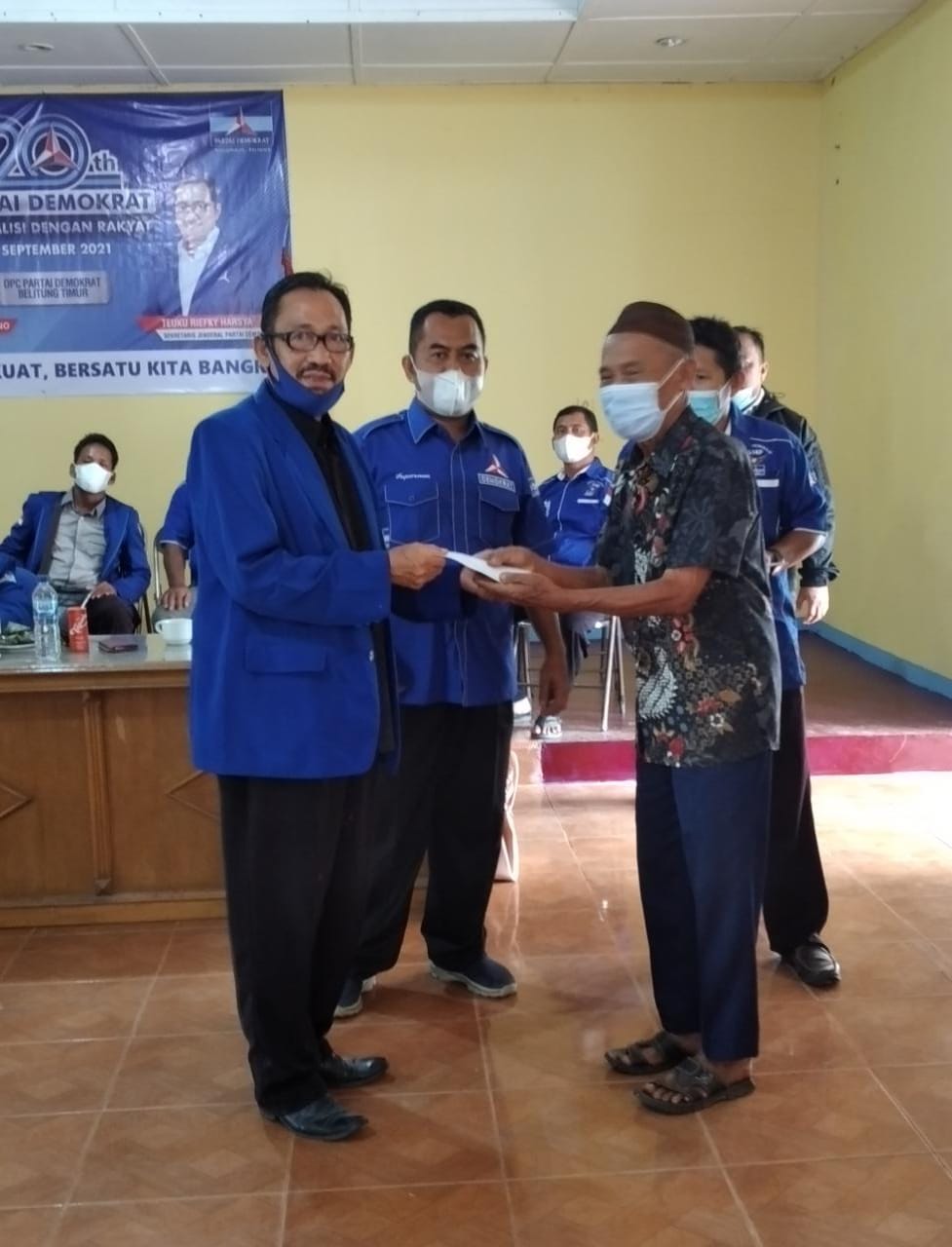 Dikesempatan yang sama Suparman anggota DPRD kabupaten Belitung Timur dari partai Demokrat mengatakan bertepatan di ulang tahun ke 20 Partai Demokrat DPC PD Beltim memberikan bantuan kepada masyrakat sekitar.