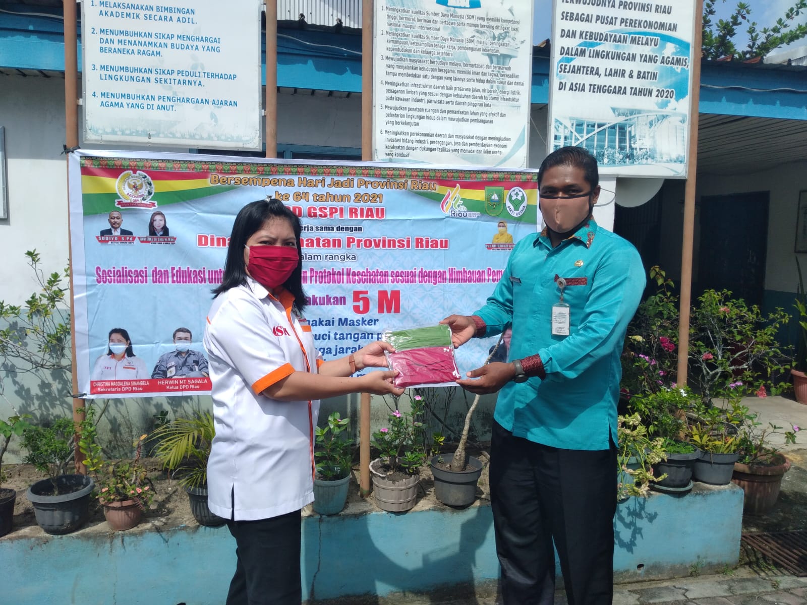 Di SDN 032 Rumbai ini, DPD GSPI Riau bekerja sama dengan Dinas Kesehatan Provinsi Riau, menyerahkan bantuan berupa Masker untuk seluruh anak didik sekolah, serta tenaga pengajar. Diserahkan oleh Christina Magdalena Sinambela selaku Sekretaris DPD GSPI Riau kepada Kepala Sekolah SDN 032 Rumbai.