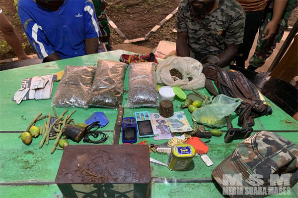 “Setelah itu (dua) orang masyarakat yg mencurigakan melintas keluar dari jalan tikus dan kemudian dilaksanakan penutupan jalan oleh anggota Pos, dan dilaksanakan pemeriksaan terhadap masyarakat tersebut, kemudian di dapati barang Narkotika jenis Ganja sebanyak 3 paket dengan berat 825 Gram” Terang Pasi 1/Intel