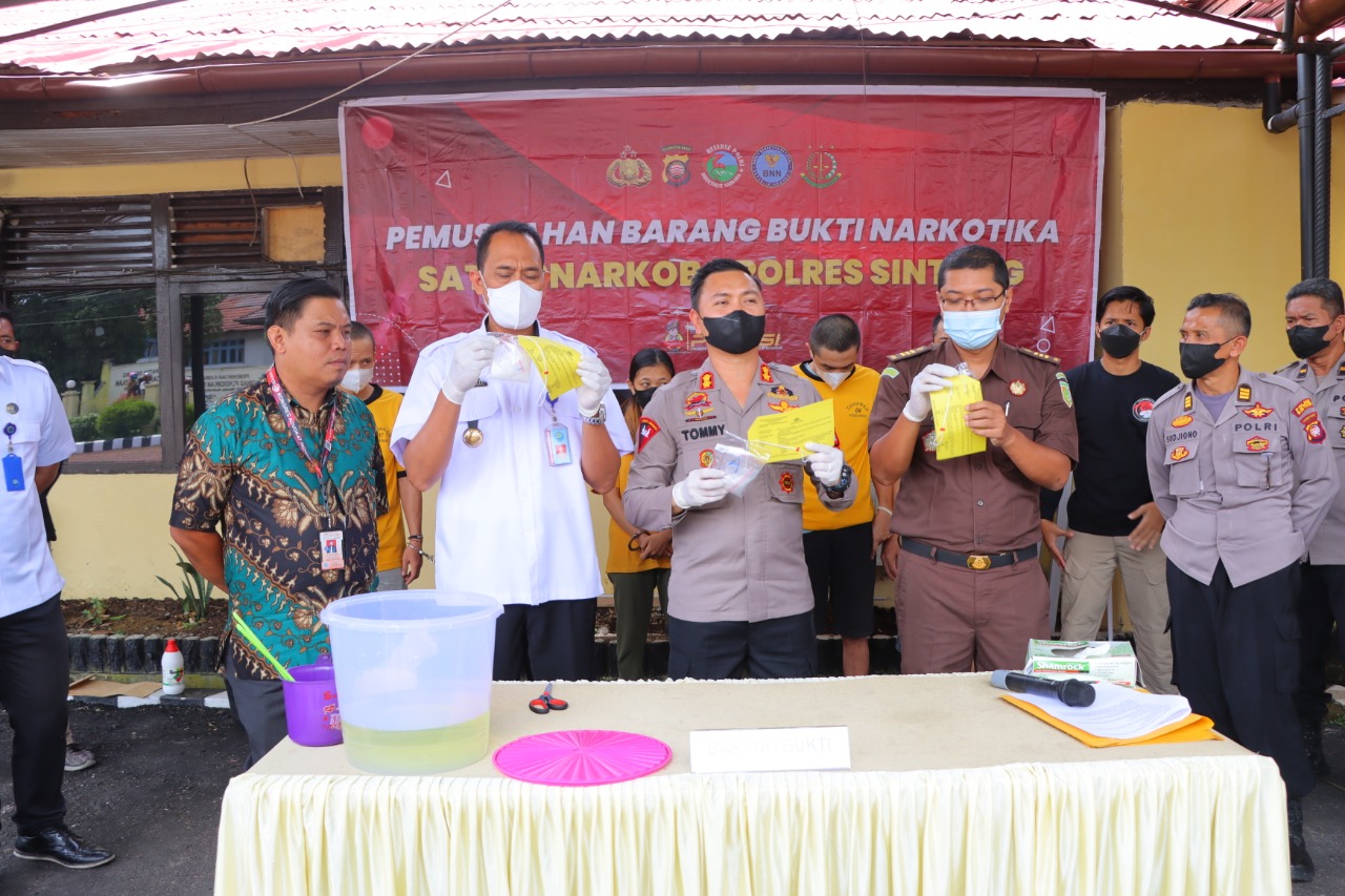 Usai menerangkan kasus-kasus tersebut Kapolres Sintang bersama dengan Kepala BNN dan perwakilan Kejaksaan Negeri langsung memusnahkan barang bukti berupa narkotika jenis shabu dengan cara memasukannya kedalam tempat yang sudah diisikan cairan racun.
