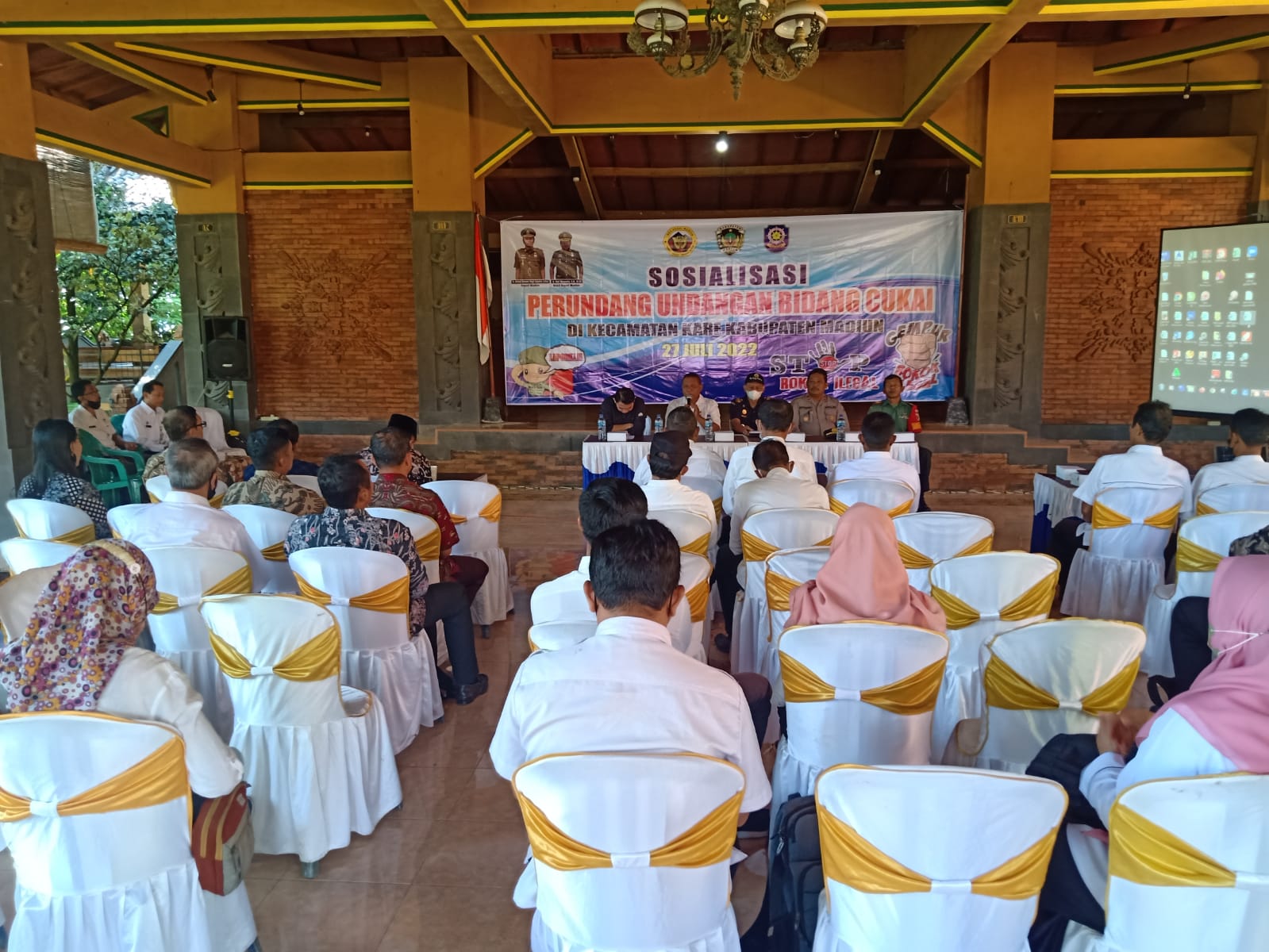Bertempat di pendopo aswinloka kare sosialisasi dilaksanakan kali ini sosialisasi ditujukan untuk jajaran kepala desa serta unsur lembaga desa yang ada di wilayah kare kabupaten madiun,tujuan sosialisasi ini adalah untuk mengedukasi kepala desa serta jajaran lembaga desa agar ke depan mempunyai pengetahuan terkait peraturan per undang-undangan serta mendeteksi apa yang di sebut rokok ilegal dan nantinya bisa memberikan pemahaman kepada warganya agar tidak memproduksi serta mengkonsumsi rokok ilegal.
