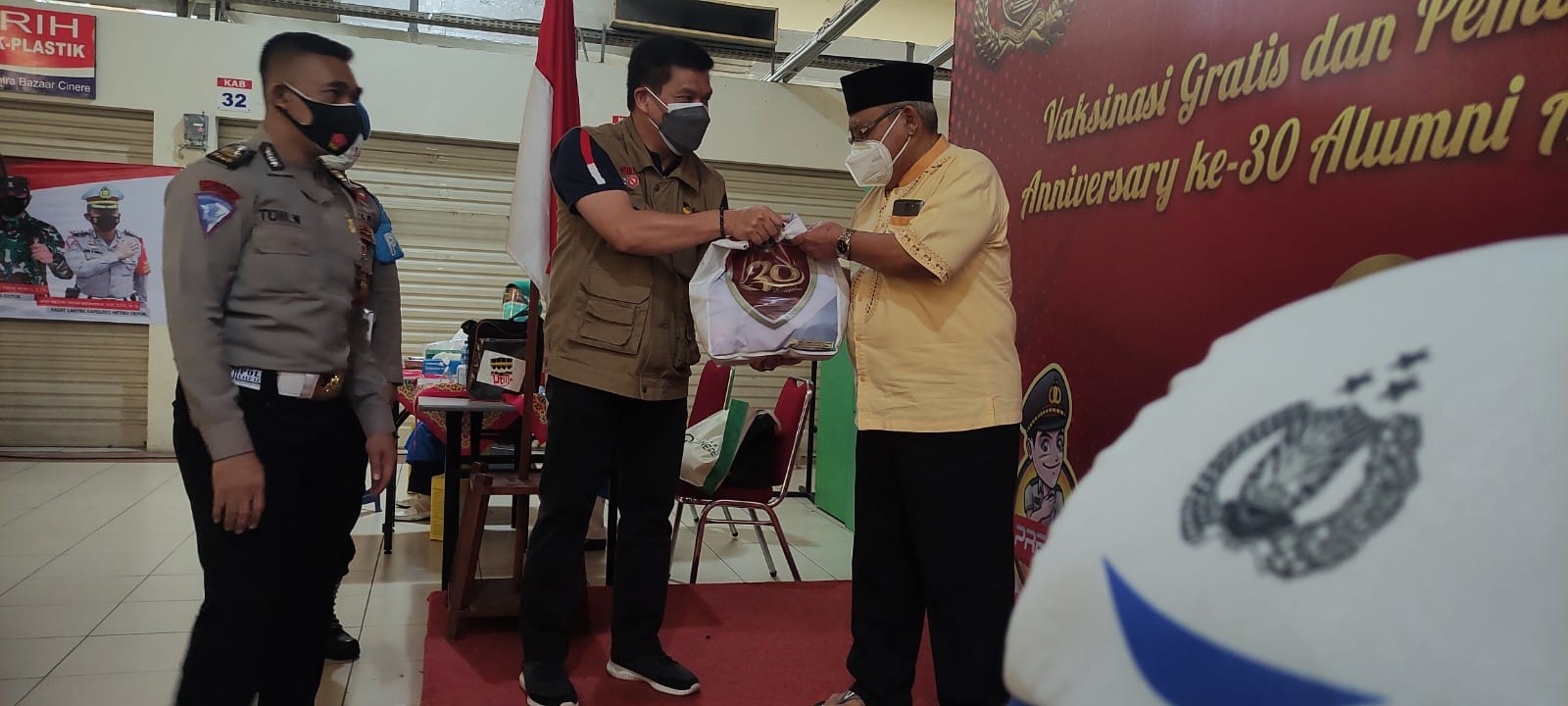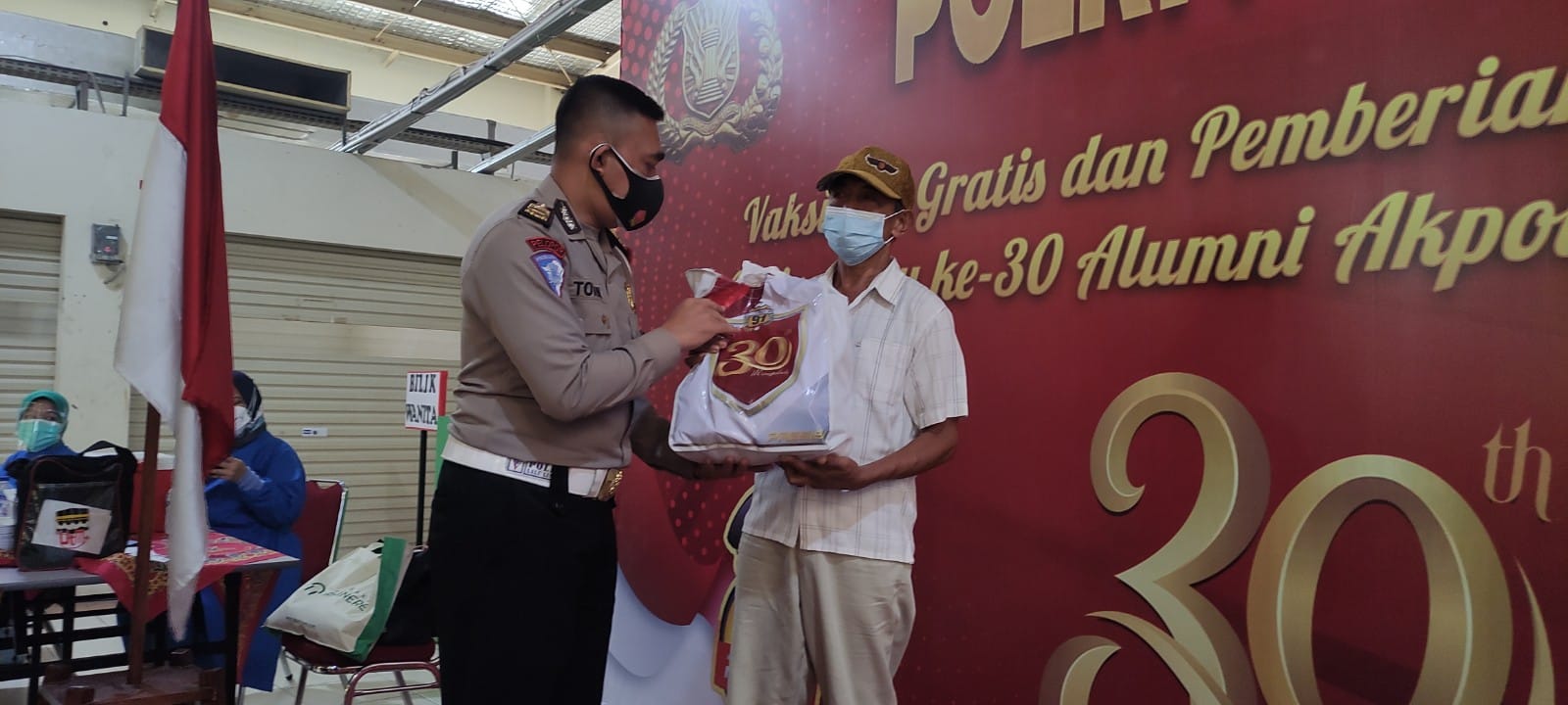 Selain menggelar vaksinasi di Gerai Vaksin Presisi juga memberikan kesempatan kepada Akpol angkatan 91 untuk memberikan bantuan sembako kepada masyarakat Cinere dan Sekitarnya yang diserahkan secara simbolis oleh Kapolsek Cinere Kompol Tata Irawan.