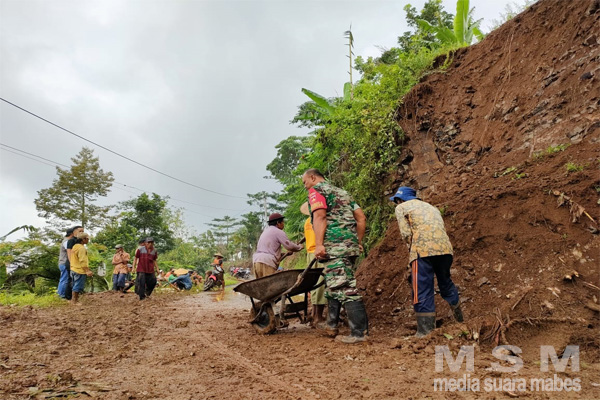 “Hujan lebat menyebabkan tanah di samping jalan longsor dan menutupi badan jalan, sehingga menggangu kenyamanan pengguna jalan, setelah berkoordinasi dengan aparat desa kita sepakat untuk mengadakan kerja bakti bersama warga untuk membersihkan sisa-sisa material longsoran agar tidak jalan tersebut dapat dilalui oleh warga,” terang Babinsa.