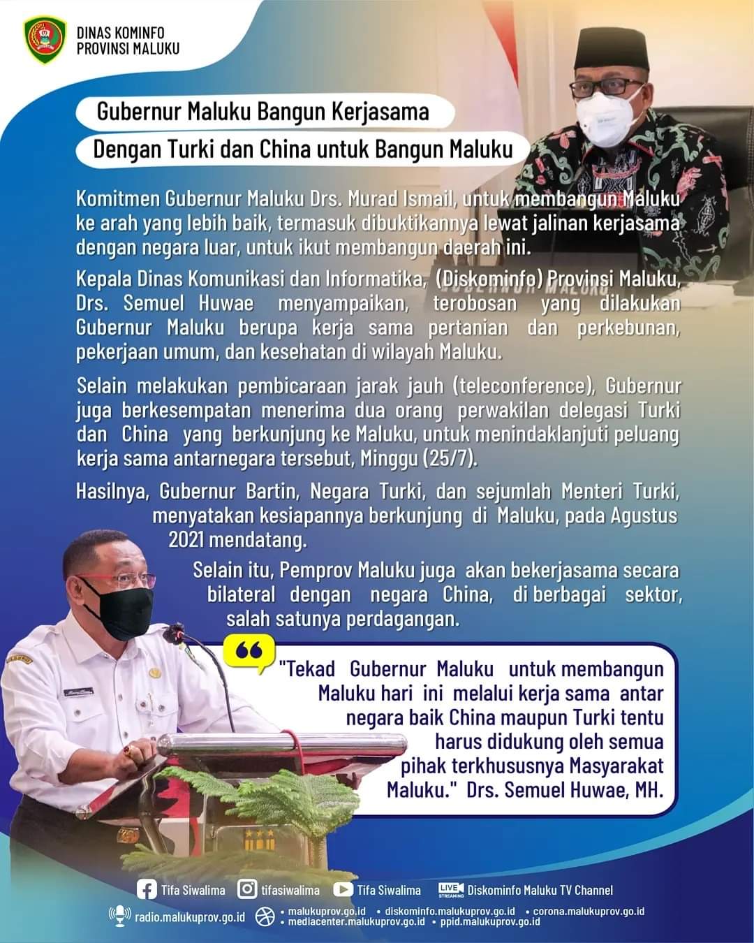 Selain melakukan pembicaraan jarak jauh (teleconference), Gubernur juga berkesempatan menerima dua orang perwakilan delegasi Turki dan Cina yang berkunjung ke Maluku, untuk menindaklanjuti peluang kerja sama antarnegara tersebut, Minggu (25/7).