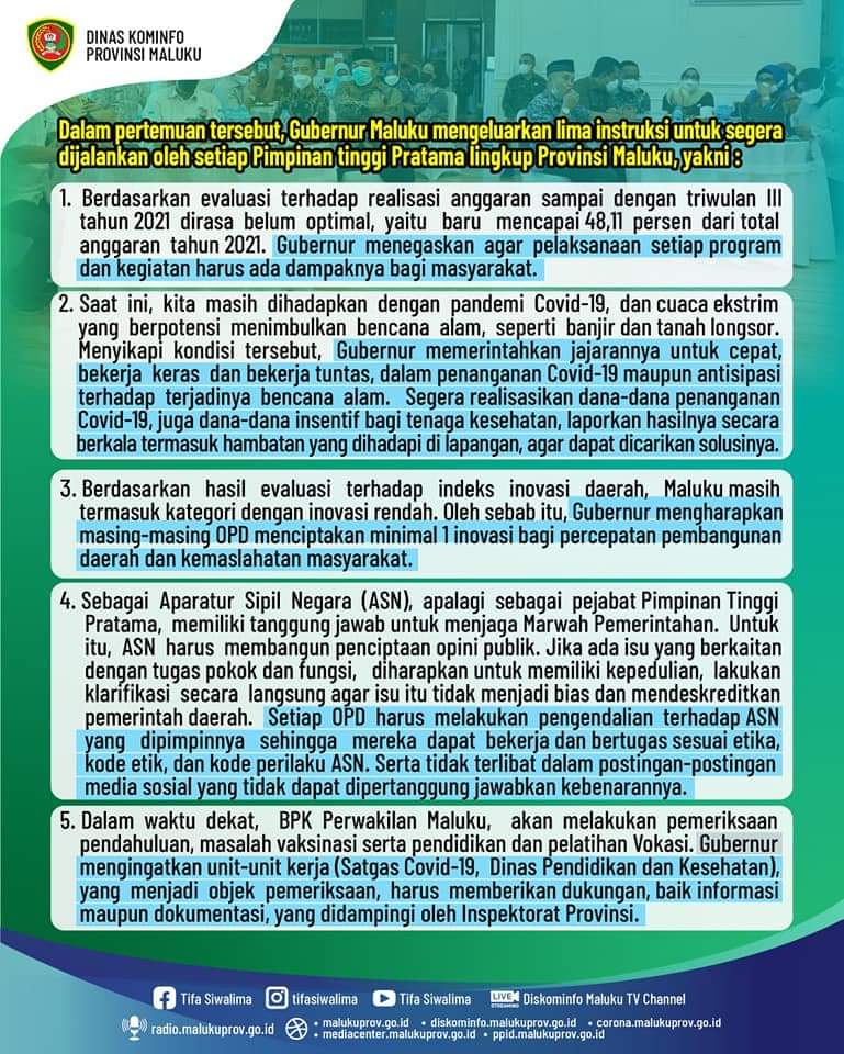 Dalam pertemuan tersebut, Gubernur Maluku mengeluarkan lima instruksi untuk segera dijalankan oleh setiap Pimpinan tinggi Pratama lingkup Provinsi Maluku.