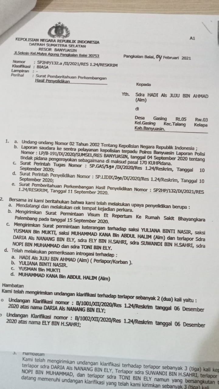 MediaSuaraMabes, Banyuasin– Hadi (32) warga Gasing Kecamatan Talang Kelapa Kabupaten Banyuasin Provinsi Sumatera Selatan, yang korban pengeroyokan pada 03 September 2020 terus mendesak pihak kepolisian dari Polres Banyuasin segera menangkap para pelakunya, karena dianggap laporanya oleh pihak Kepolisian dari Polres Banyuasin tidak serius menindaklanjuti kasusnya, maka Hadi meminta kasusnya untuk dipublikasikan.