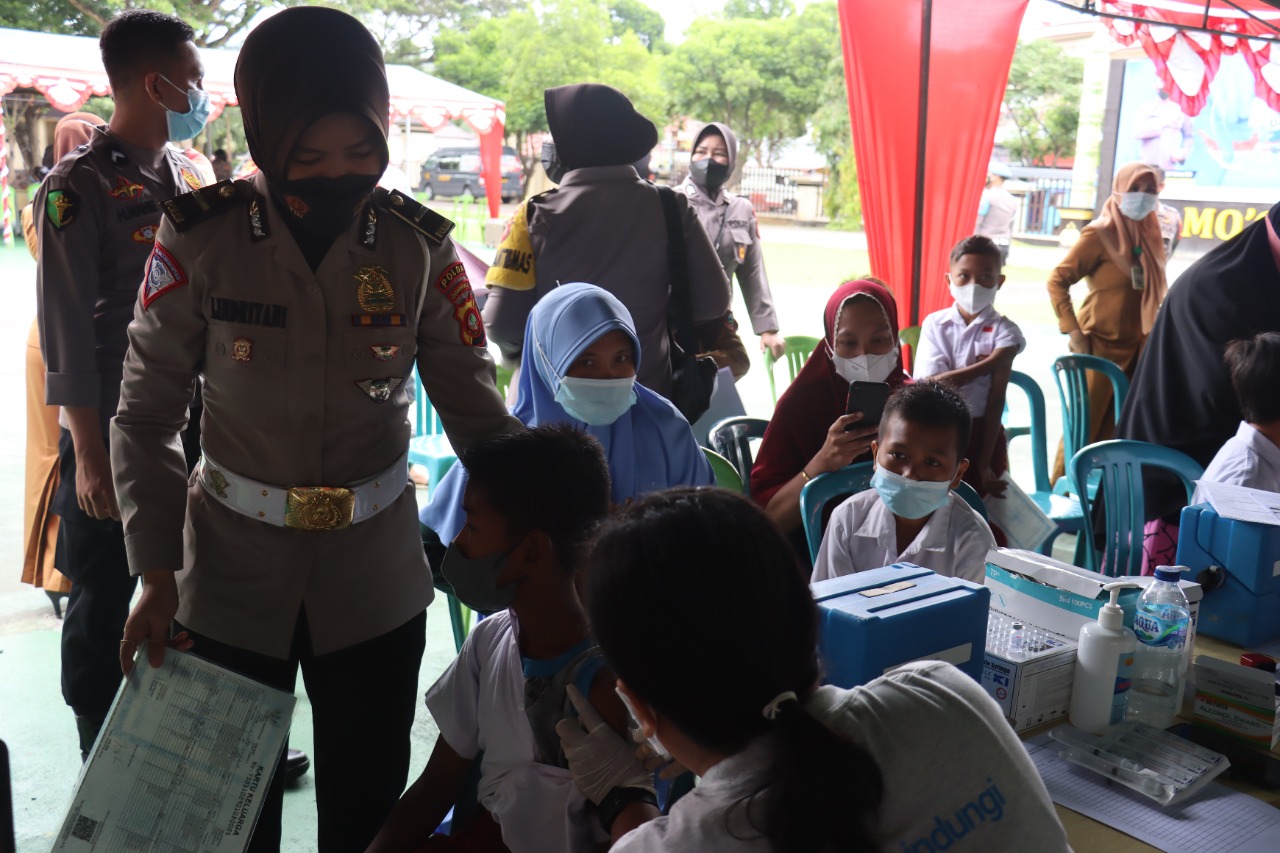 Dalam mendukung upaya percepatan vaksinasi khususnya bagi anak usia 6-11 Tahun, Polda Gorontalo kembali menerjunkan personel Polwan dalam membantu anak-anak untuk mendapatkan vaksin Covid-19. Seperti dalam Vaksinasi yang digelar di Lapangan Mapolda Gorontalo. Senin, (17/01).