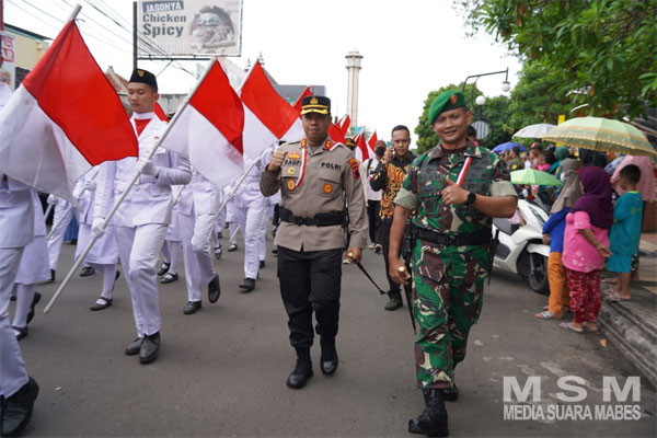 Nampak Kapolres Batang AKBP Saufi Salamun dan Komandan Kodim 0736/Batang Letkol Inf. Ahmad Alam Budiman turut berjalan kaki dalam kirab merah putih.