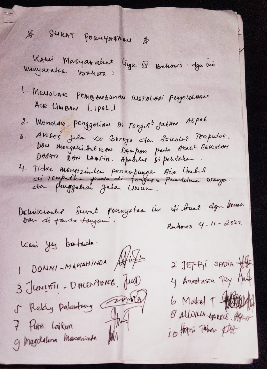 Diketahui sebayak 71 orang warga Kelurahan Tongkaina Lingkungan IV Bahowo menolak proyek IPAL tersebut dengan membuat penolakan di kertas dan di tanda tangani.