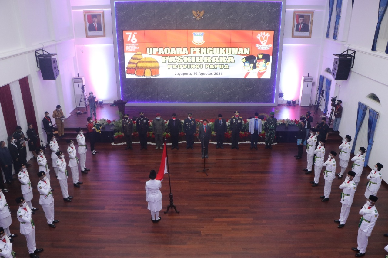 SuaraMabes, Jayapura – Pada hari Senin tanggal 16 Agustus 2021 bertempat di Lukmen Hall Gedung Negara, Distrik Jayapura Utara, Kota Jayapura, telah dilaksanakan Upacara Pengukuhan Pasukan Pengibar Bendera Merah Putih Tingkat Provinsi Papua yang dipimpin oleh Plt. Sekda Provinsi Papua Dr. Muhammad Ridwan Rumasukun, SE.,MM. selaku Pembina Upacara dan Kapten (Kes) Budi Mulyono selaku Pemimpin Upacara.