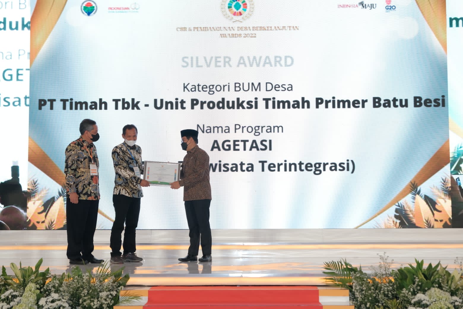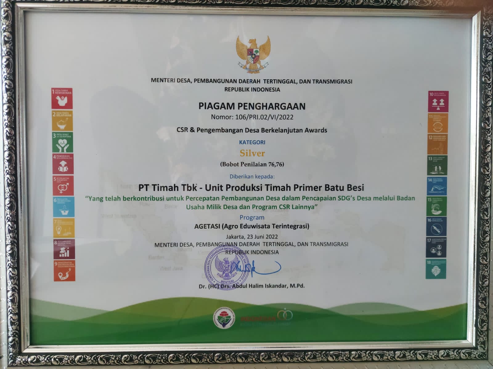 PT Timah Tbk Unit Produksi Timah Primer Batu Besi meraih penghargaan ini lantaran telah berkontribusi untuk percepatan pembangunan Desa dalam pencapaian SDG’s melalui Badan Usaha Milik Desa dan Program CSR Lainnya melalui program Agro Eduwisata Terintegrasi (AGETASI) di Desa Burung Mandi, Kecamatan Damar, Kabupaten Belitung Timur.