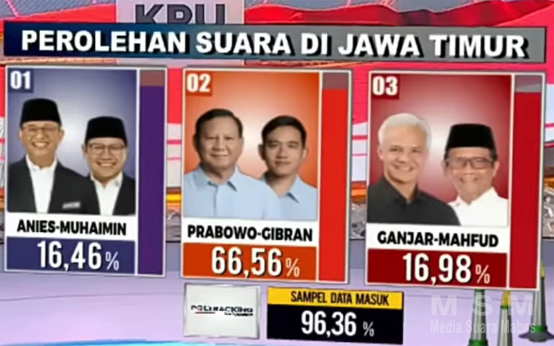 MediaSuaraMabes, Pacitan – Melansir hasil hitung cepat perolehan suara Presiden dan wakil Presiden di PEMILU 2024,dari hasil hitung cepat Lembaga Survei Poltracking Indonesia, 14 Februari 2024 pukul.23.WIB.