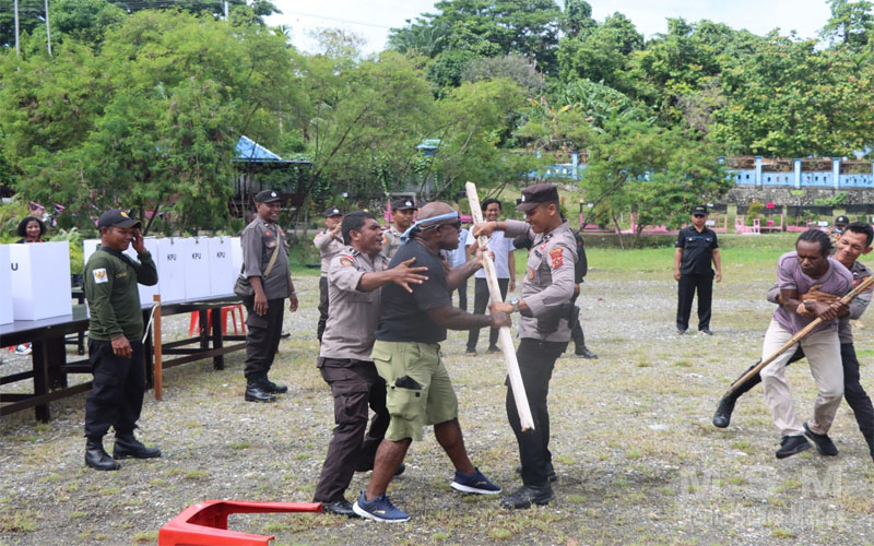 “Kegiatan simulasi sispamkota ini kami mempunyai beberapa tahapan yang kiranya nanti akan sesuai dengan sistem pengamanan pemilu di kabupaten nabire, sesuai peta kerawanan kabupaten Nabire. Dimulai dari tahapan Pengamanan Massa Tenang, Pengamanan Pungutan Suara hingga penanganan unjuk Rasa” ucap Wakapolres Nabire.