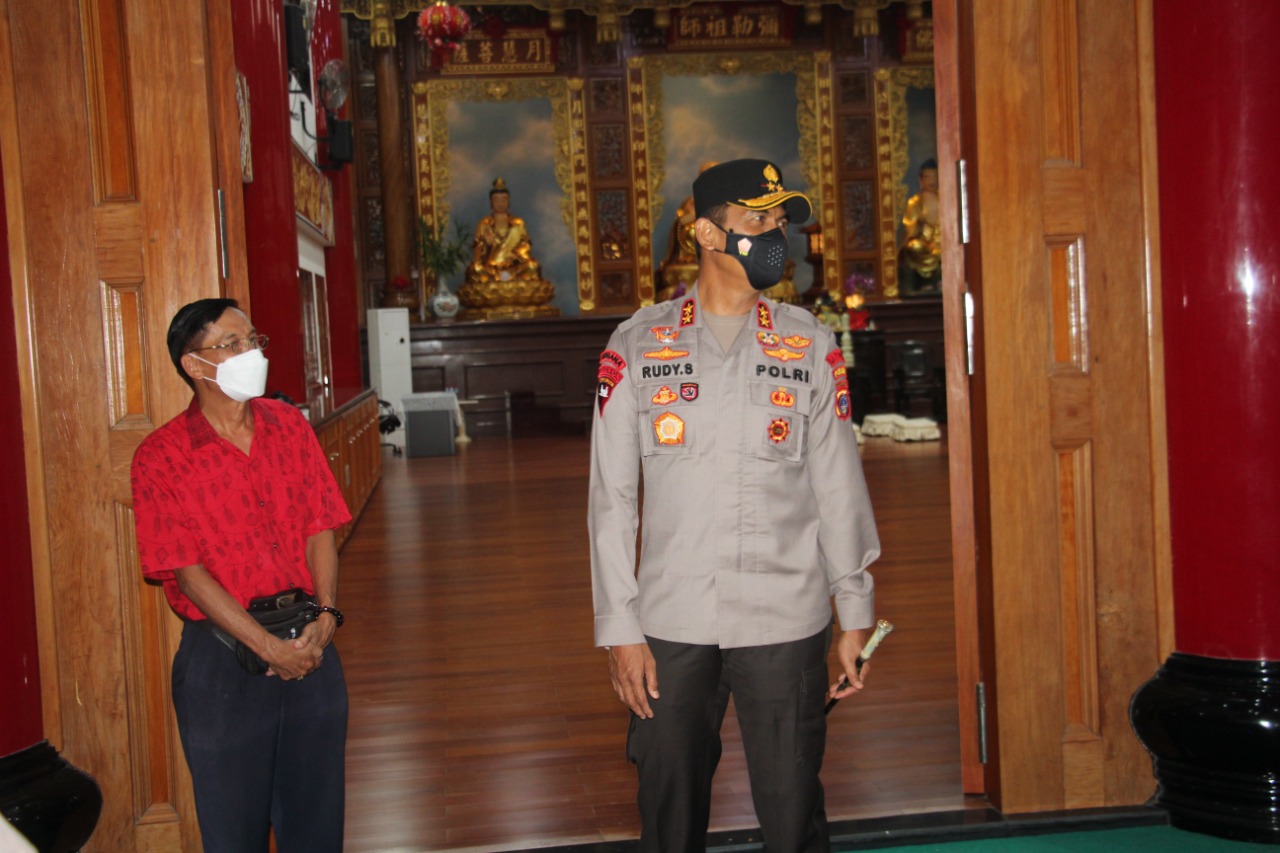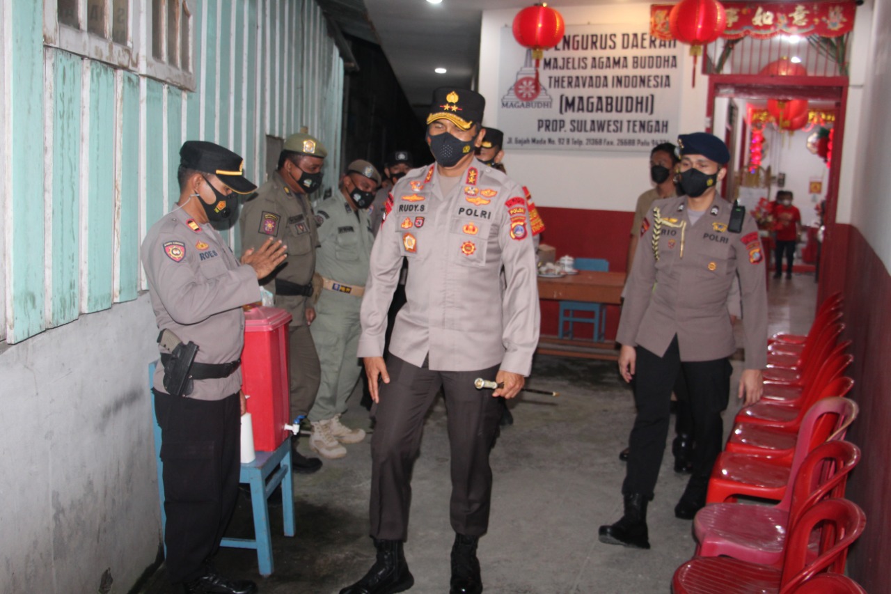 Kapolda Sulteng nampak melihat-lihat situasi baik didalam atau diluar tempat ibadah didampingi oleh pengurus vihara seraya berpesan untuk menjaga protokol kesehatan.