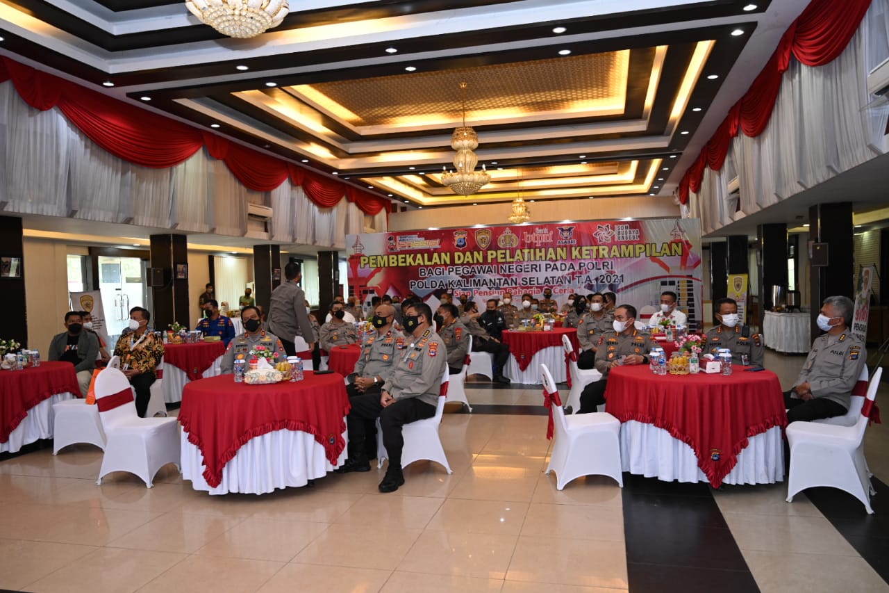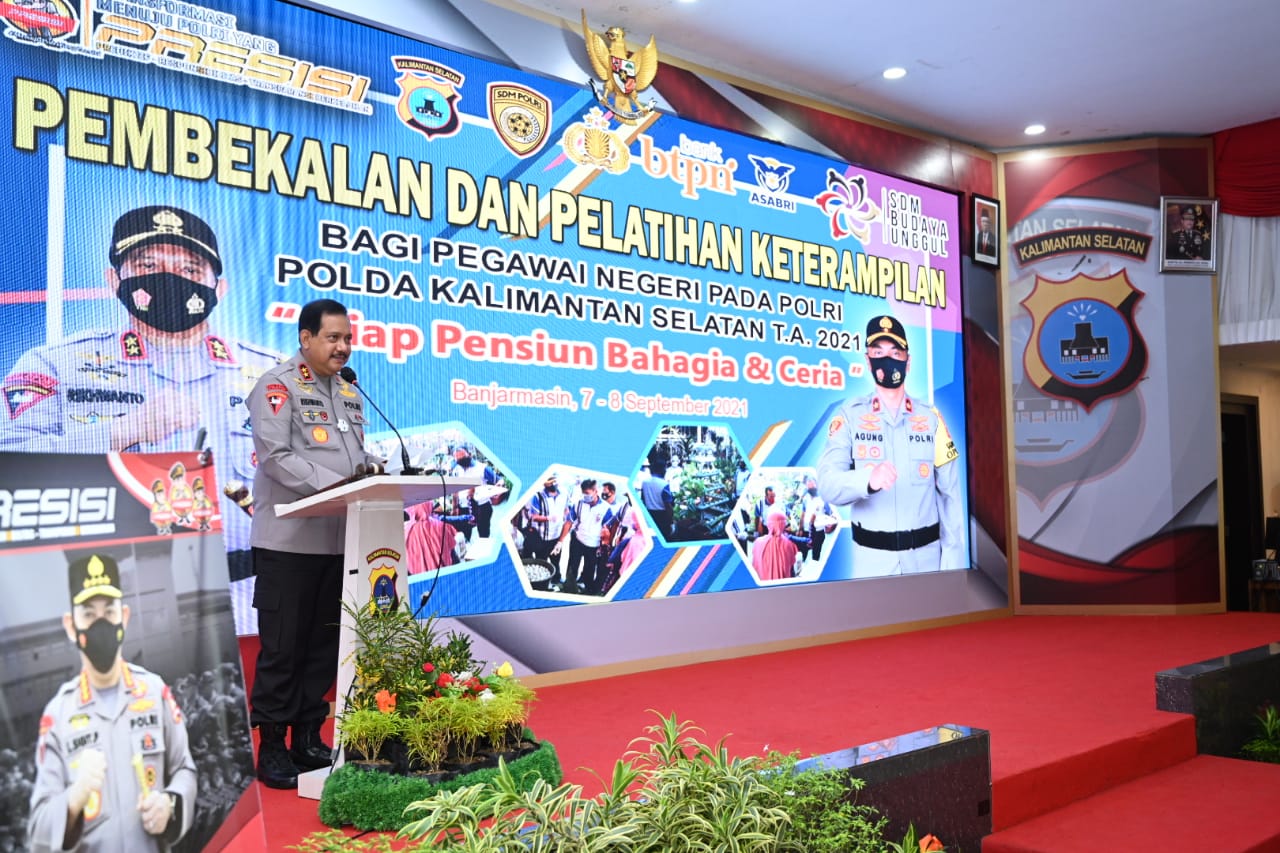 Kapolda Kalsel Irjen Pol Drs. Rikwanto, S,H., M.Hum. membuka kegiatan Pembekalan dan Pelatihan Keterampilan bagi personel yang akan memasuki masa pensiun tahun anggaran 2021, dengan dihadiri Wakapolda Kalsel, Irwasda dan Pejabat Utama Polda Kalsel.