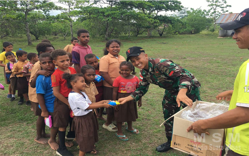 MediaSuaraMabes, Merauke – Satgas Pamtas Kewilayahan Yonif 125/Smb berbagi kebahagiaan dengan menggelar Si’mbisa Berbagi Kasih di seluruh jajaran pos yang tersebar di 3 Kabupaten yaitu Merauke, Mappi, dan Asmat kepada masyarakat di wilayah penugasan pada Jum’at (08/12/2023).