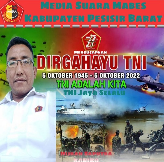 MediaSuaraMabes, Pesisir Barat – Salam Satu Jiwa, Salam Satu Komando saya Hijrah Saputra Kabiro Media Suara Mabes Kabupaten Pesisir Barat dan sekaligus mewakili Keluarga Besar Media Suara mabes mengucapkan Dirgahayu Tentara Nasional Indonesia yang ke 77.