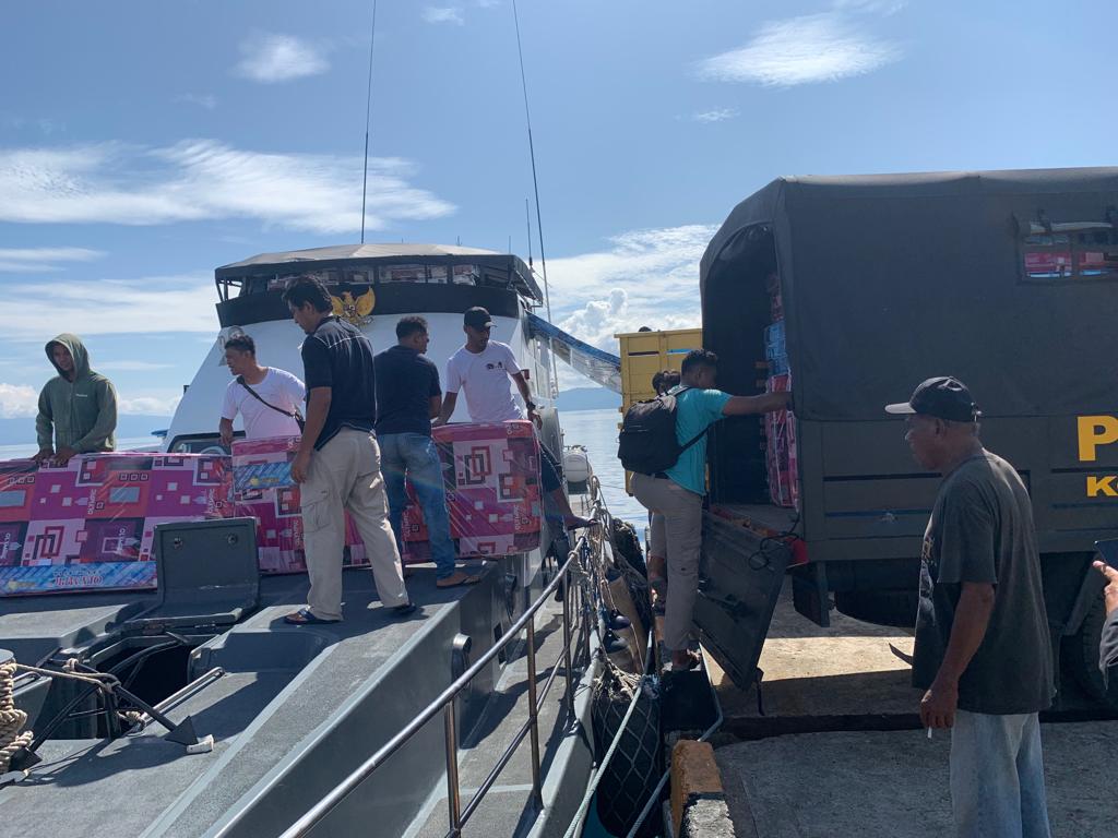 Bantuan sosial berupa ratusan buah kasur, termos, dan sebagainya ini dikirim personel Direktorat Polairud (Ditpolairud) Polda Maluku menggunakan KP. XVI – 3001 Tg. Alang dan KP. XVI – 2003, Minggu (13/3/2022).