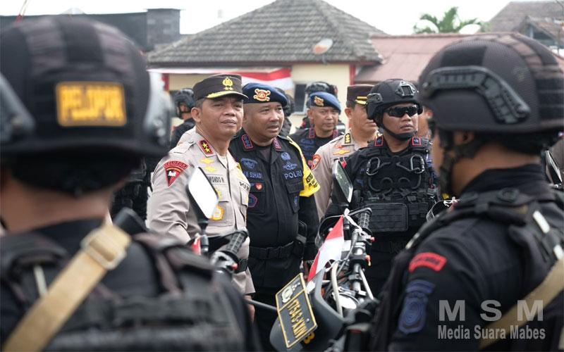 MediaSuaraMabes, Yogyakarta – Kapolda DIY Irjen Pol Suwondo Nainggolan S.I.K., M.H., didampingi Dansat Brimob Polda DIY Kombes Pol Imam Suhadi, S.I.K dan para Pejabat Utama Polda DIY melaksanakan pengecekan kekuatan dan perkuatan Satgas Tindak Satbrimob Polda DIY dalam kesiapan pengamanan Pemilu 2024.