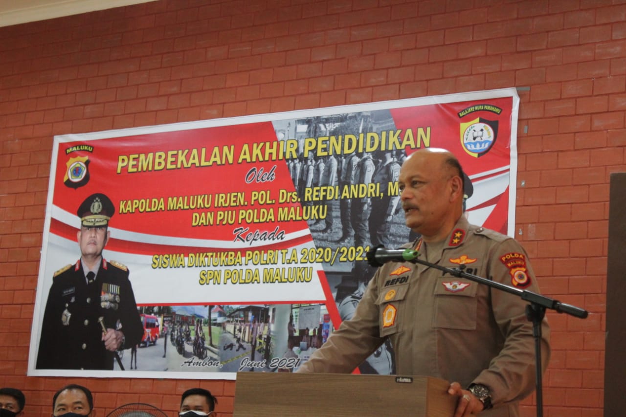MediaSuaraMabes, MALUKU – Kepala Kepolisian Daerah Maluku Irjen Pol Drs Refdi Andri, M.Si, memberikan pembekalan akhir kepada sebanyak 231 orang siswa yang mengikuti Pendidikan Pembentukan Bintara (Diktukba) Polri Tahun Ajaran 2020-2021 di SPN Polda Maluku, Passo, Kota Ambon, Jumat (25/6/2021).