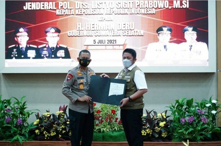 Penghargaan itu didapatkan Herman Deru berdasarkan SK Kapolri dengan Nomor Keputusan /1088/VI/2021 tentang pemberian penghargaan kepada anggota Kepolisian dan warga Negara Indonesia (WNI) yang berprestasi dan membantu tugas Kepolisian.