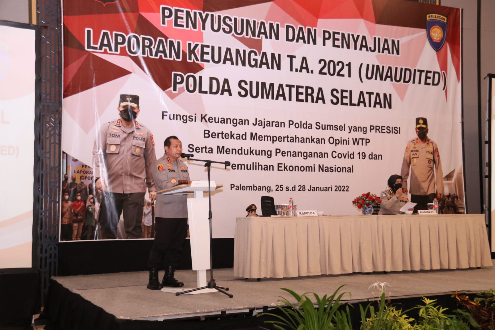 MediaSuaraMabes, PALEMBANG — Kapolda Sumsel, Irjen Pol Drs Toni Harmanto MH membuka secara langsung kegiatan penyusunan dan penyajian laporan keuangan Polri 2021 tingkat Polda Sumsel di Hotel Santika Premiere, Selasa (25/1).