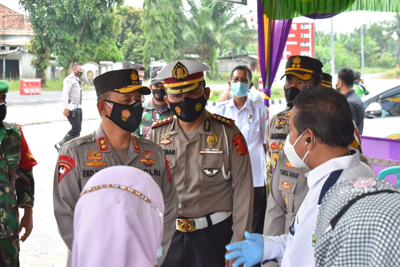 SuaraMsbes Kayuagung – Kapolda Sumsel Irjen Pol Prof Dr Eko Indra Heri S, MM didampingi PJU Polda Sumsel mengapresiasi kesiapan pos pam lebaran dan pusat karantina Covid-19 di wilayah Ogan Komering Ilir disaksikan Kapolres OKI AKBP Alamsyah Pelupessy,