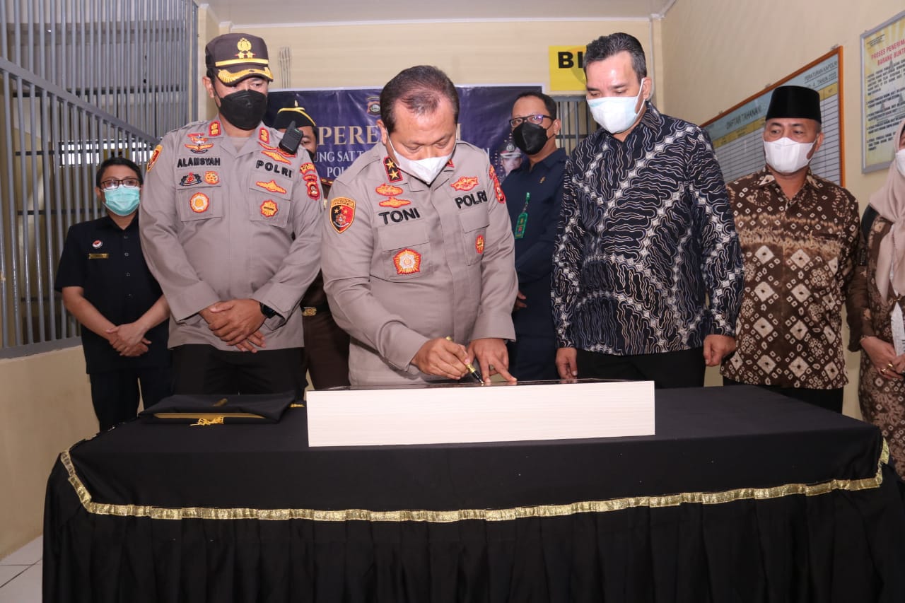 MediaSuaraMabes, PALEMBANG — Kapolda Sumsel, Irjen Pol Drs Toni Harmanto MH didampingi Wakapolda Sumsel Brigjen Pol Rudi Setiawan,Sik,SH MH PJU dan Para Kasatwil Jajaran Polda Sumsel resmikan Satuan Tahti dan rumah tahanan Polres Musi Banyuasin, Kamis (13/1/2022).