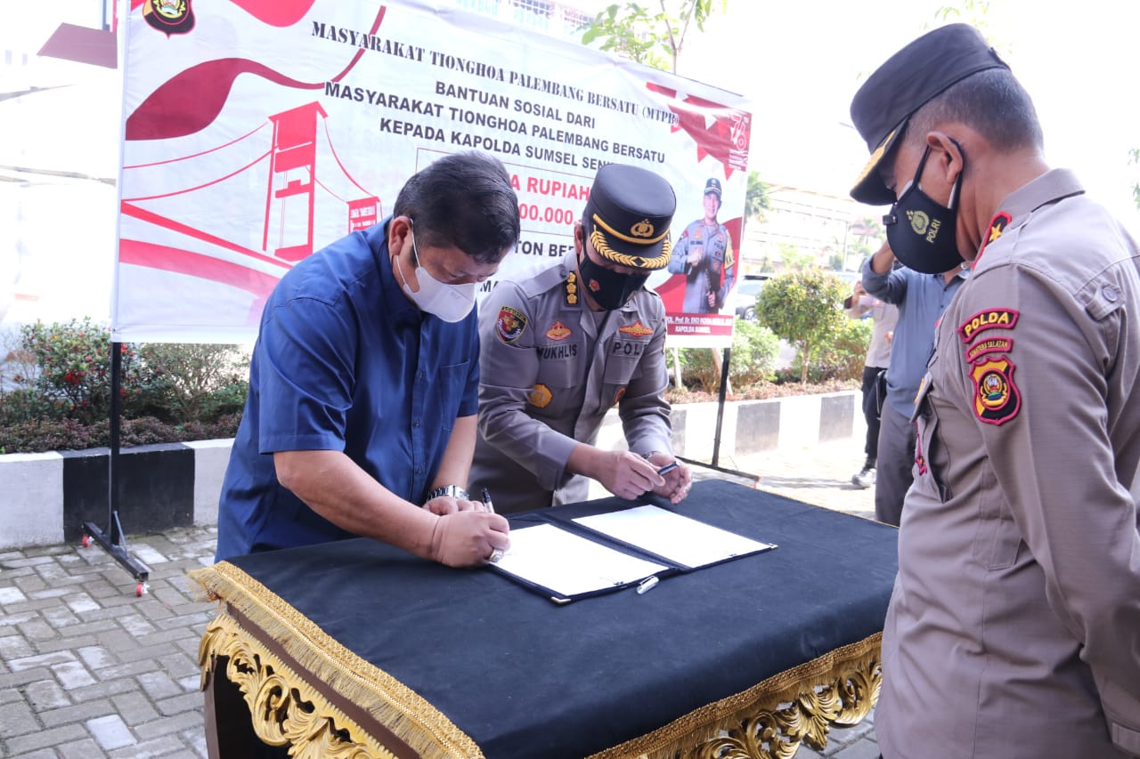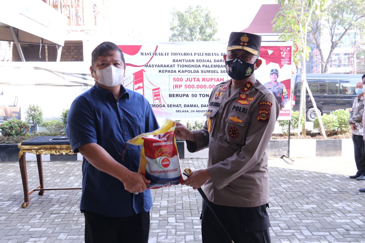 SuaraMabes, PALEMBANG – Kapolda Sumatera Selatan (Sumsel), Irjen Pol Prof Dr Eko Indra Heri S MM didampingi Wakapolda Sumsel Brigjen Pol.Rudi Setiawan Sik SH MH dan PJU Polda Sumsel terima secara simbolis Bantuan beras dari Masyarakat Tionghoa Palembang Bersatu diLobby Gedung Promoter Mapolda Sumsel, Selasa (24/8).