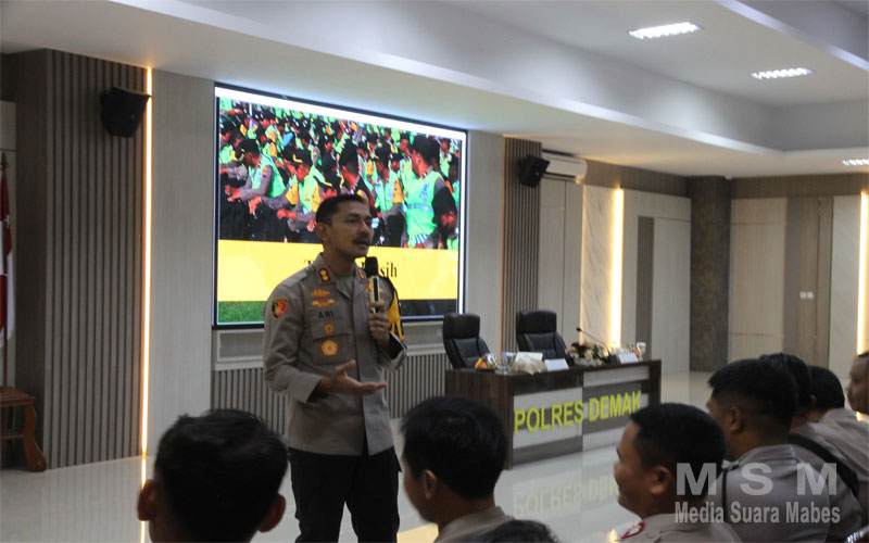MediaSuaraMabes, Demak – Kapolres Demak AKBP Ari Cahya Nugraha memberikan arahan dan Pembinaan kepada Bhabinkamtibmas jajaran Polres Demak di Aula Wicaksana Laghawa Polres Demak, Selasa (17/9/2024).