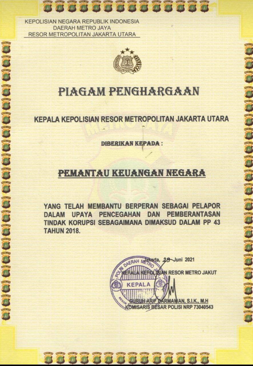 Dan atas PP 43 tahun 2018 Kapolres Jakarta utara memberikan Penghargaan ini kepada PEMANTAU KEUANGAN NEGARA PKN yang diberikan sebagai penghargaan kepada masyarakat yang aktip dan atau yang telah melaporkan dugaan korupsi ke Pihak Penyidik. demikian Ucap patar