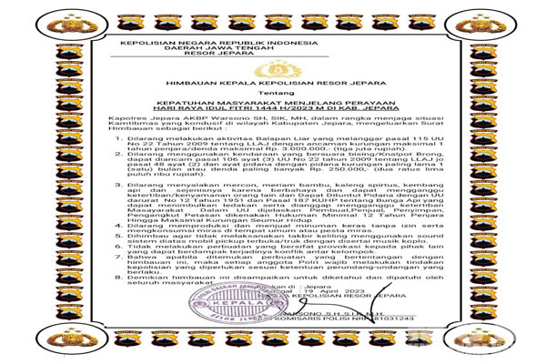 MediaSuaraMabes, Jepara — Kepala Kepolisian Resor Jepara mengeluarkan Surat Himbauan tentang Kepatuhan Masyarakat Menjelang Perayaan Hari Raya Idul Fitri 1444 H/2023 M Di Kabupaten Jepara Jawa Tengah. Rabu (19/04/2023).