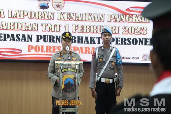 MediaSuaraMabes, Jepara – Kapolres Jepara AKBP Warsono, SH., SIK., MH., memimpin pelaksanaan Upacara Kenaikan Pangkat Pengabdian Polri TMT 01 Februari 2023 dan pelepasan sejumlah anggota Polri yang telah memasuki pensiun (purna tugas) Tahun 2022.