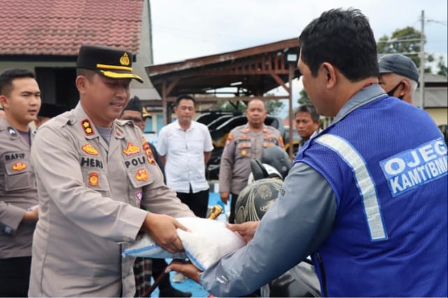 Kapolres Lampung Barat Bersama Tokoh NU Memberikan Bantuan Berupa Beras Kepada Ojek Pangkalan