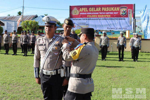 MediaSuaraMabes, Waropen – Polres Waropen, Waren – Kepala Kepolisian Resor Waropen AKBP. Iip Syarif Hidayat, S.H., pimpin Apel Gelar Pasukan Operasi Patuh Cartenz 2023 di Lapangan Apel Mapolres Waropen, Senin (10/07/2023).