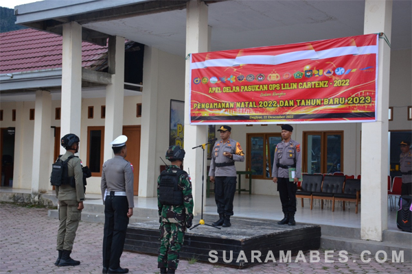 MediaSuaraMabes, Dogiyai – Bertempat di Polres Dogiyai Jln Trans Nabire – Enarotali, Distrik Kamuu, Kabupaten Dogiyai, Provinsi Papua Tengah telah dilaksanakan kegiatan Apel Gelar Pasukan Ops Lilin Cartenz-2022 dalam rangka pengamanan Natal 25 Desember 2022 dan Tahun Baru 01 Januari 2023 yang dipimpin langsung oleh Kapolres Dogiyai Kompol Samuel D Tatiratu. S.I.K.