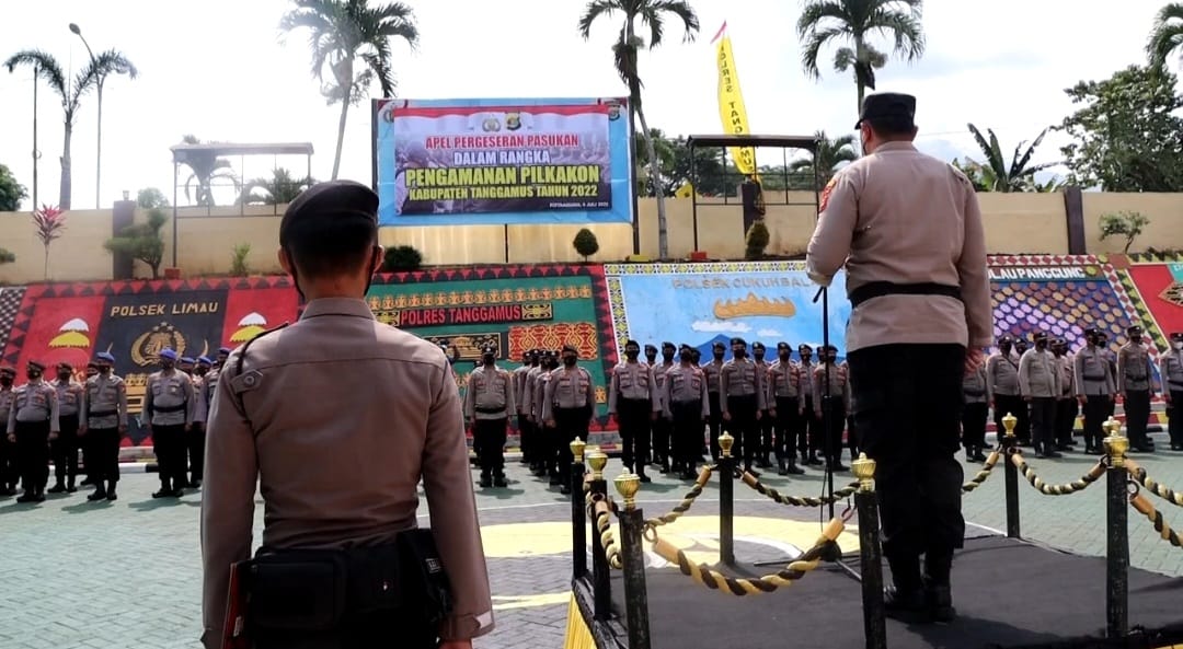 MediaSuaraMabes, Tanggamus – Jelang pemilihan kepala pekon (Pilkakon) serentak di Kabupaten Tanggamus, Polres Tanggamus Polda Lampung menggelar apel pergeseran pasukan pengamanan, Rabu, 6 Juli 2022, siang.