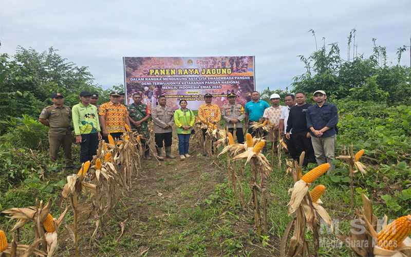 MediaSuaraMabes, Ketapang Kalbar — Kapolsek Jelai Hulu Ipda Zaenal Mutakhir, S.H. bersama Camat Jelai Hulu Seth Ariel, S.Th., Kepala Desa Periangan Paskalis Didi, serta Manager Gaharu Estate PT Bangun Nusa Mandiri (BNM) Ginting, melaksanakan kegiatan pemanenan jagung hibrida di areal perkebunan PT BNM, Desa Periangan, Kecamatan Jelai Hulu, pada Kamis, 13 November 2025.