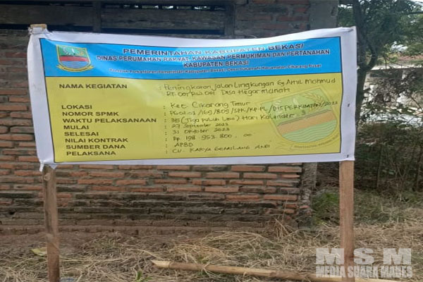MediaSuaraMabes, Bekasi – Peningkatan jalan lingkungan yang berlokasi di Gg. Amil Mahmud Rt 01/01 yang dikerjakan oleh CV. Karya Gemilang Andi Desa Hegarmanah Kecamatan Cikarang Timur Kabupaten Bekasi, Jawa Barat.