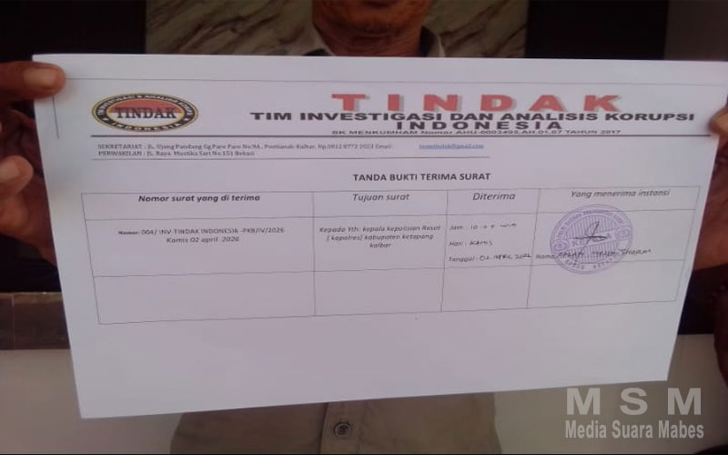 Laporan tersebut disampaikan melalui surat resmi bernomor 004/INV-TINDAK INDONESIA-PKB/IV/2026 yang ditujukan kepada Kepala Kepolisian Resor (Kapolres) Ketapang, Kalimantan Barat, terkait aktivitas penambangan yang diduga tidak memiliki izin sesuai ketentuan perundang-undangan yang berlaku.