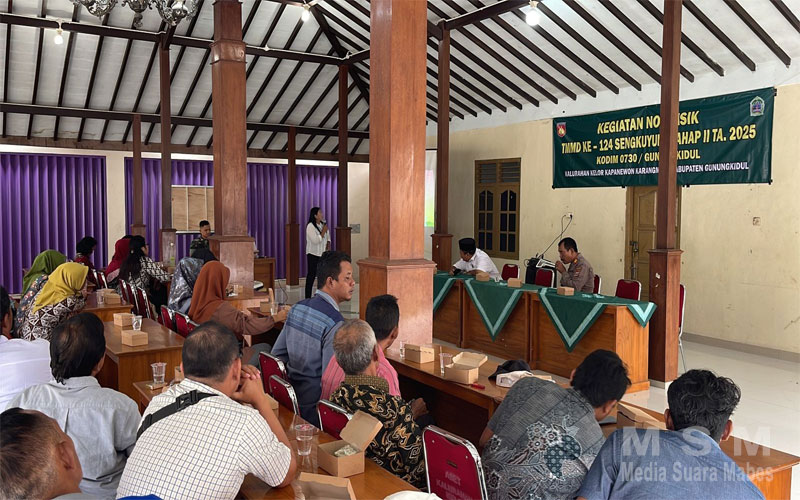 MediaSuaraMabes, Gunungkidul – Selain menggelar kegiatan fisik berupa pembangunan insfrastruktur, Tentara Manunggal Membangun Desa (TMMD) Sengkuyung Ke 124 Tahap II Tahun Anggaran 2025 Kodim 0730/Gunungkidul melaksanakan kegiatan non fisik dengan berbagai materi penyuluhan di antaranya, Penyuluhan Wawasan Kebangsaan dan Bela Negara dari Kodim 0730/Gunungkidul, Penyuluhan Kamtibmas dan Sadar Hukum dari Polres/Polsek Gunungkidul, Penyuluhan Pencegahan penyakit pada hewan ternak (PMK) dari Puskeswan Karangmojo, Penyuluhan KB Kesehatan dan pencegahan Stunting dari Klinik Kartika 0730, kegiatan non fisik dengan penyuluhan Bela Negara dan Wawasan Kebangsaan yang dilaksanakan bertempat di Balai Padukuhan Ngunut Lor, Kalurahan Kelor, Kapanewon Karangmojo, Kabupaten Gunungkidul, Rabu(21/05/2025).